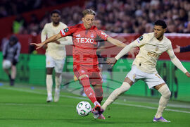 Aberdeen's Jesper Karlsson, left, and Shakhtar Donetsk's Vinicius Tobias in action during the Conference League soccer match between Aberdeen and Shakhtar Donetsk at the Pittodrie Stadium, Aberdeen, Scotland, Thursday Oct. 2, 2025. (Steve Welsh/PA via AP)