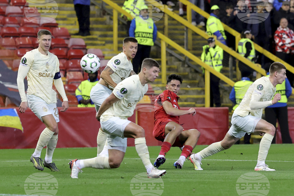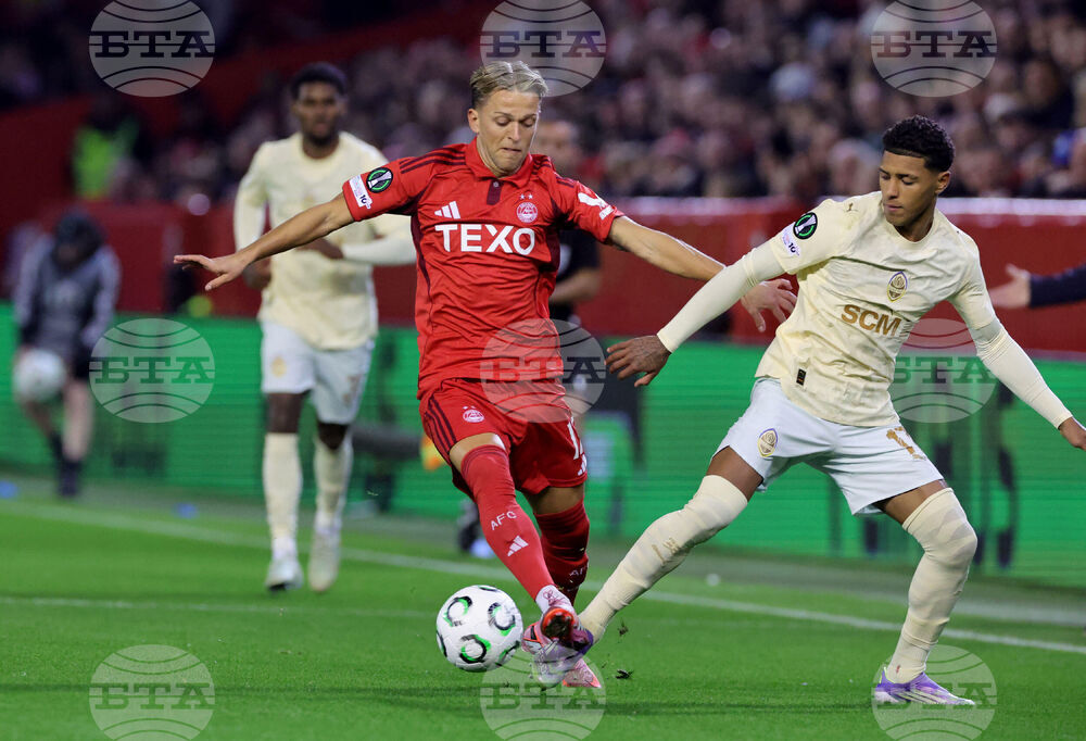 Aberdeen's Marko Lazetic, center right, in action during the Conference League soccer match between Aberdeen and Shakhtar Donetsk at the Pittodrie Stadium, Aberdeen, Scotland, Thursday Oct. 2, 2025. (Steve Welsh/PA via AP)