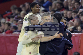 Shakhtar Donetsk's Yegor Nazaryna, center, celebrates scoring during the Conference League soccer match between Aberdeen and Shakhtar Donetsk at the Pittodrie Stadium, Aberdeen, Scotland, Thursday Oct. 2, 2025. (Steve Welsh/PA via AP)