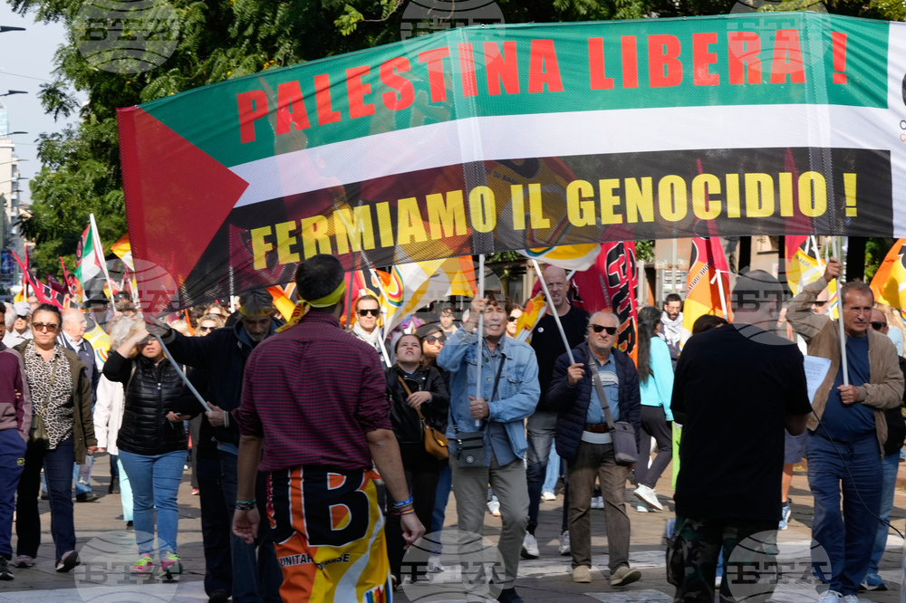 Pro-Palestinian demonstrators gather for a national general strike called by different unions to protest against the situation in Gaza two days after Israeli forces intercepted a Gaza-bound aid flotilla in the Mediterranean Sea, in Milan, Italy, Friday, Oct. 3, 2025. (AP Photo/Luca Bruno)