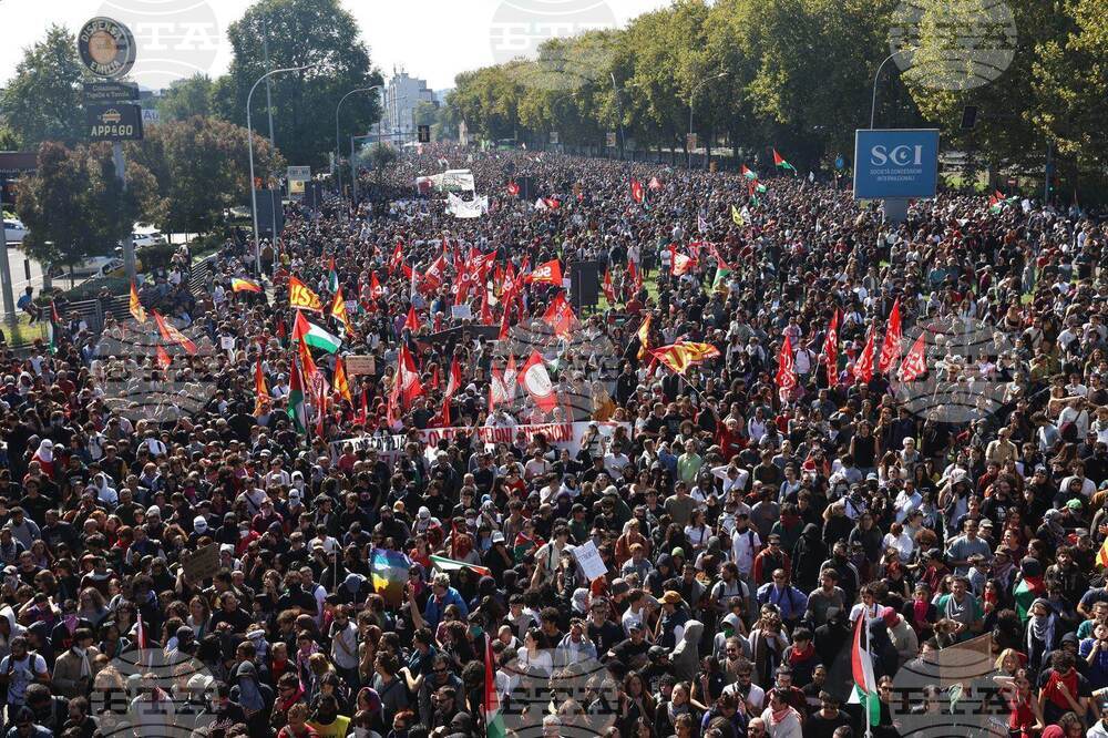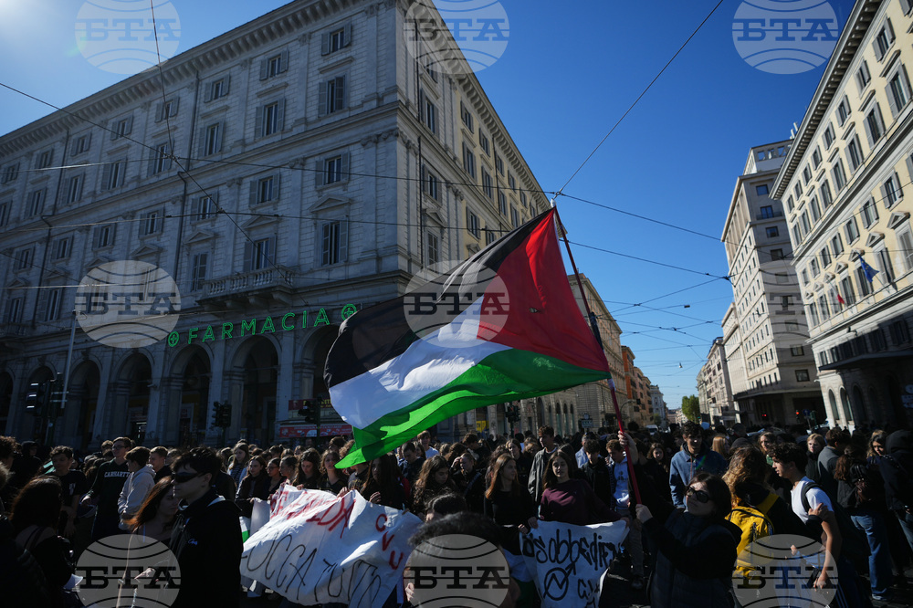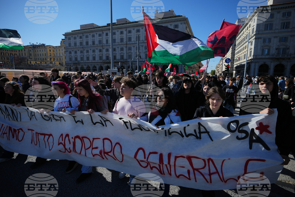 Pro-Palestinian demonstrators gather for a national general strike called by different unions to protest against the situation in Gaza two days after Israeli forces intercepted a Gaza-bound aid flotilla in the Mediterranean Sea, in Rome, Friday, Oct. 3, 2025. (AP Photo/Alessandra Tarantino)