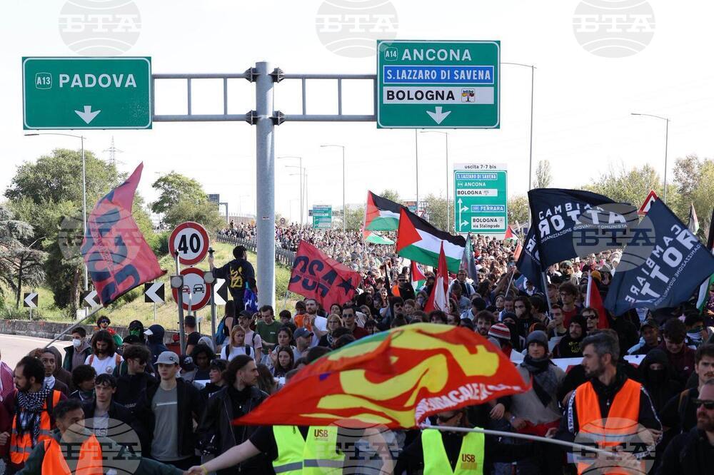 Demonstrators march on their way to block a highway during a pro-Palestinians protest in Bologna, Italy, Friday, Oct. 3, 2025. (Guido Calamosca/LaPresse via AP)