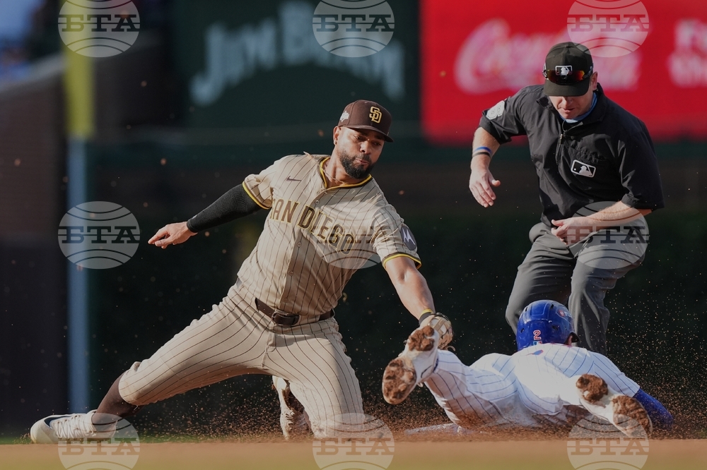 Chicago Cubs' Nico Hoerner is caught stealing second as San Diego Padres' Xander Bogaerts tags him out during the first inning of Game 3 of a National League wild card baseball game Thursday, Oct. 2, 2025, in Chicago. (AP Photo/Nam Huh)