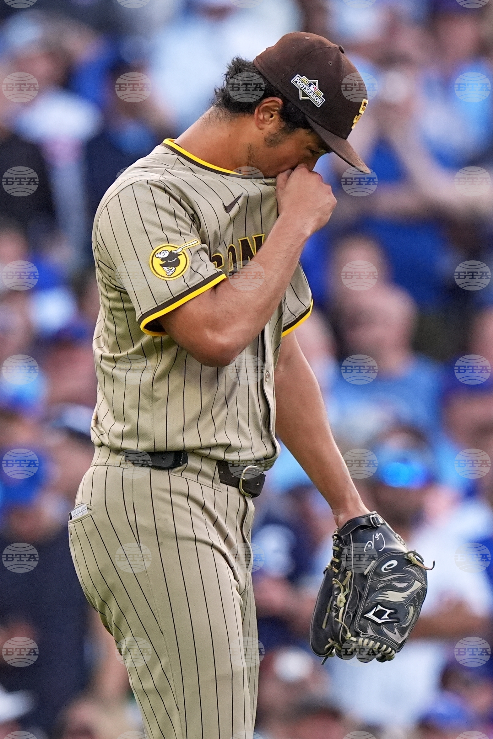 San Diego Padres' Yu Darvish leaves the game during the second inning of Game 3 of a National League wild card baseball game against the Chicago Cubs Thursday, Oct. 2, 2025, in Chicago. (AP Photo/Nam Huh)