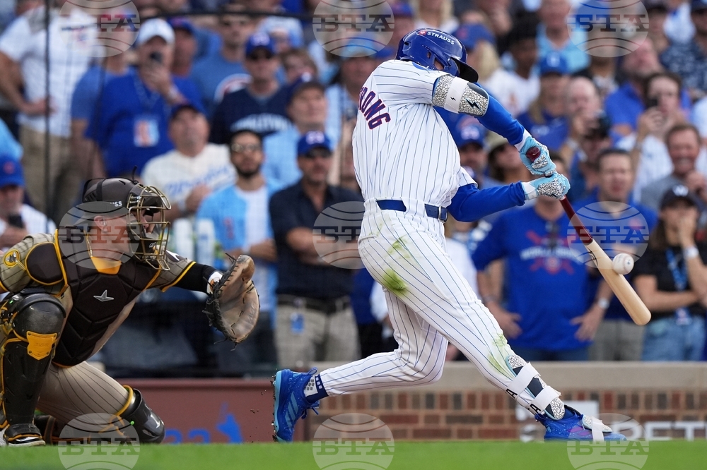 San Diego Padres' Gavin Sheets hits a single during the fifth inning of Game 3 of a National League wild card baseball game against the Chicago Cubs Thursday, Oct. 2, 2025, in Chicago. (AP Photo/Nam Huh)