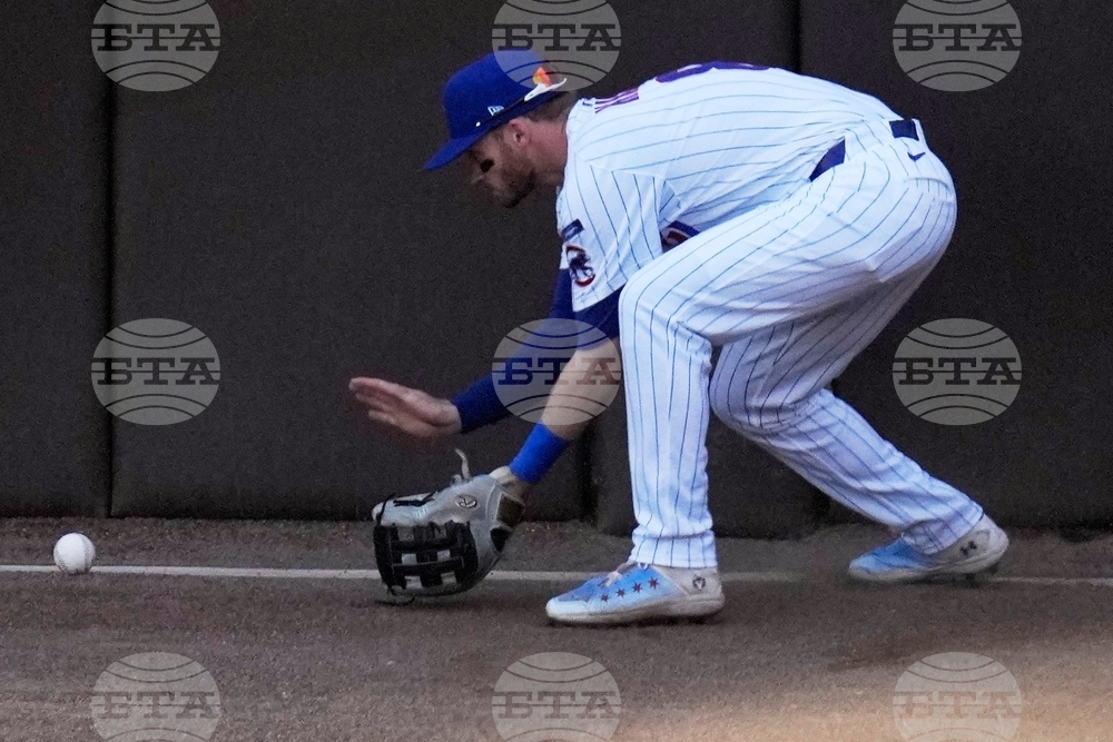 Chicago Cubs' Ian Happ tracks down a double hit by San Diego Padres' Freddy Fermin during the fifth inning of Game 3 of a National League wild card baseball game Thursday, Oct. 2, 2025, in Chicago. (AP Photo/Erin Hooley)