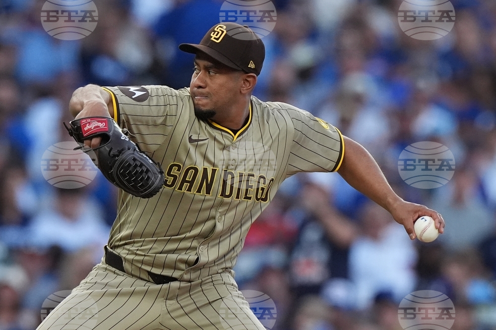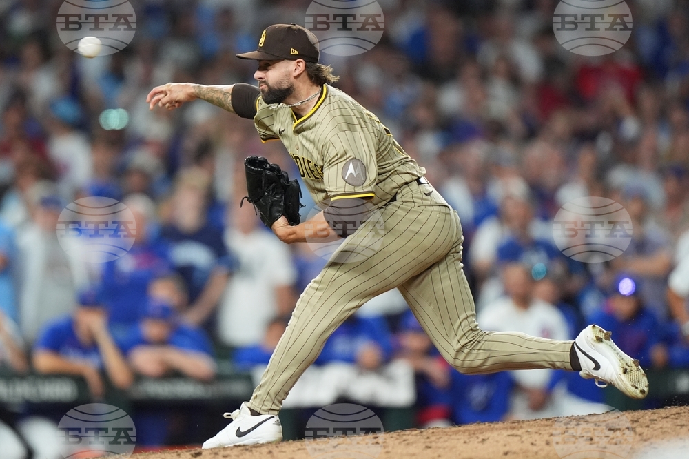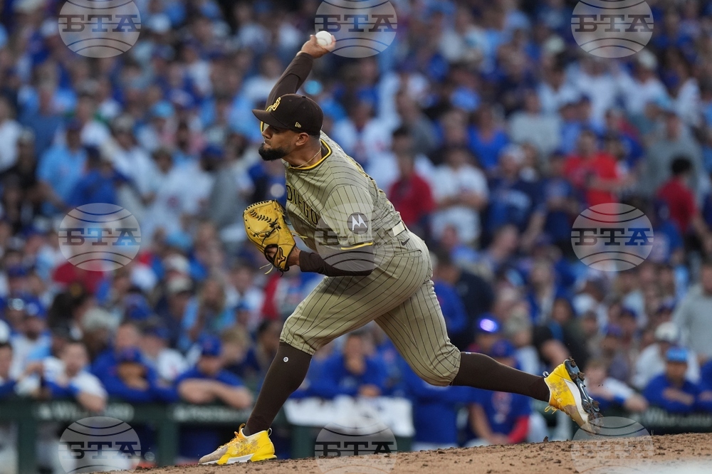 San Diego Padres' Wandy Peralta throws during the fifth inning of Game 3 of a National League wild card baseball game against the Chicago Cubs Thursday, Oct. 2, 2025, in Chicago. (AP Photo/Nam Huh)