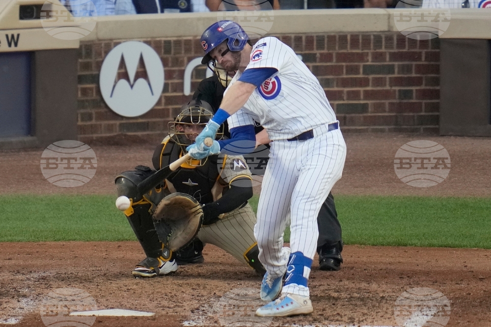 San Diego Padres' Bryce Johnson is hit by a pitch during the ninth inning of Game 3 of a National League wild card baseball game against the Chicago Cubs Thursday, Oct. 2, 2025, in Chicago. (AP Photo/Erin Hooley)