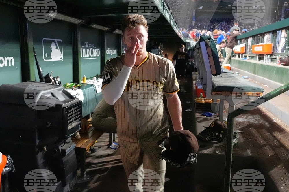 San Diego Padres' Bryce Johnson reacts as he walks to the locker room after Game 3 of a National League wild card baseball game against the Chicago Cubs Thursday, Oct. 2, 2025, in Chicago. (AP Photo/Nam Huh)