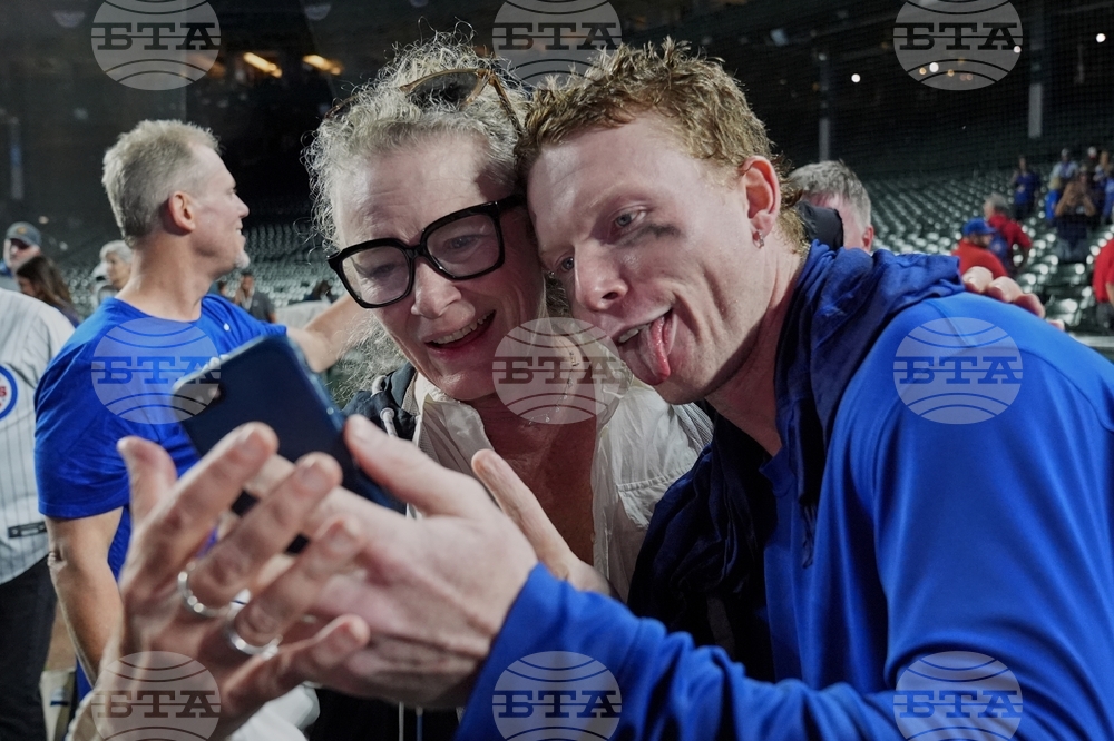 Chicago Cubs' Pete Crow-Armstrong takes a selfie with his mom after Game 3 of a National League wild card baseball game against the San Diego Padres Thursday, Oct. 2, 2025, in Chicago. (AP Photo/Nam Huh)