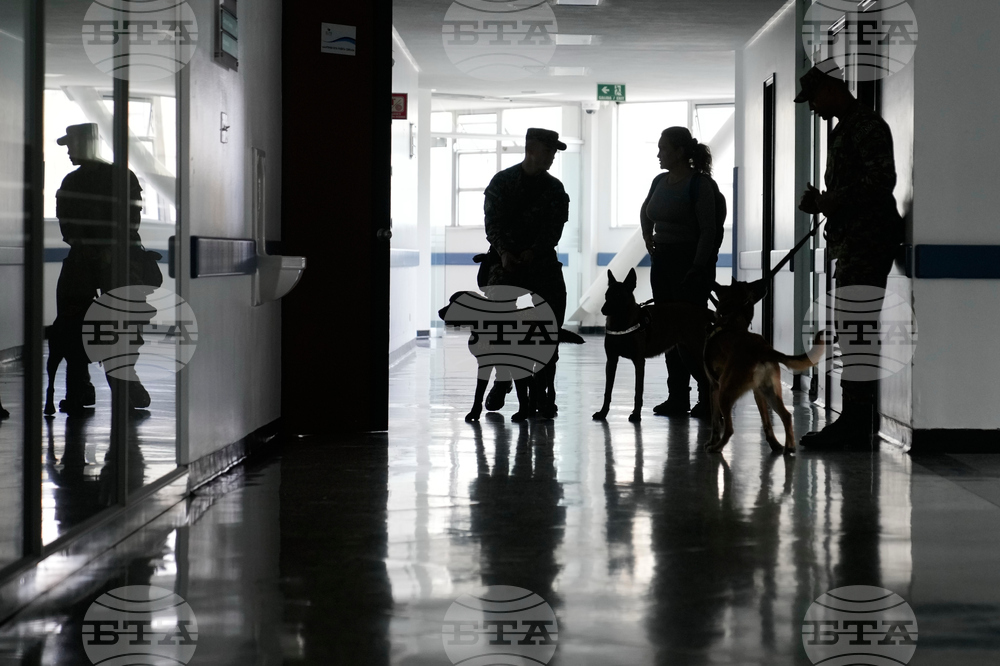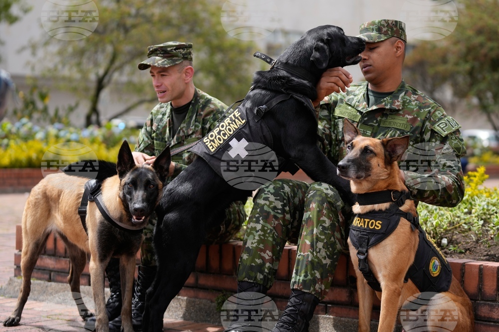 Emotional support dogs and their guides wait outside the military hospital before visiting wounded soldiers in Bogota, Colombia, Thursday, Oct. 2, 2025. (AP Photo/Fernando Vergara)