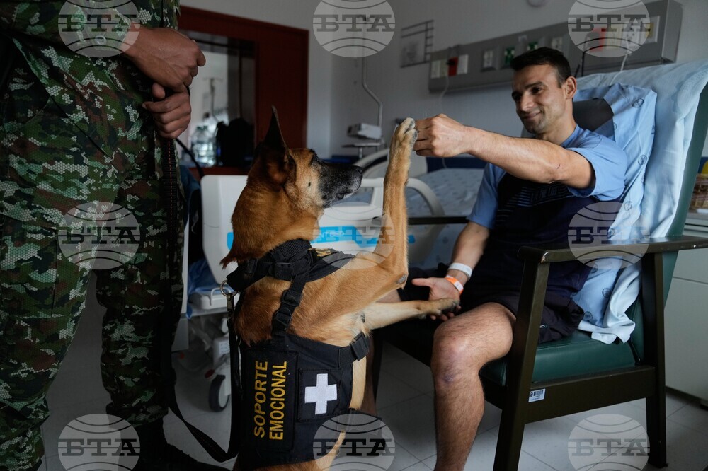 Emotional support dog Kratos salutes wounded Sgt. Jeisson Sanchez at the military hospital in Bogota, Colombia, Thursday, Oct. 2, 2025. (AP Photo/Fernando Vergara)