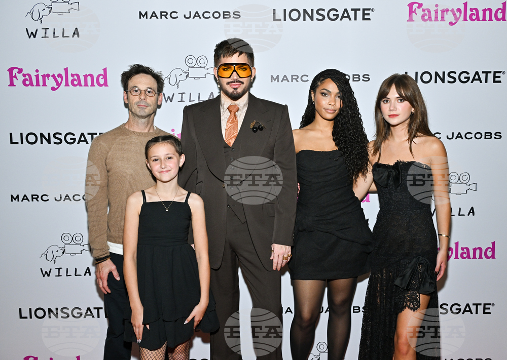 Scoot McNairy, left, Nessa Dougherty, Adam Lambert, Bella Murphy and Emilia Jones attend the premiere of "Fairyland" at the Angelika Film Center on Thursday, Oct. 2, 2025, in New York. (Photo by Evan Agostini/Invision/AP)