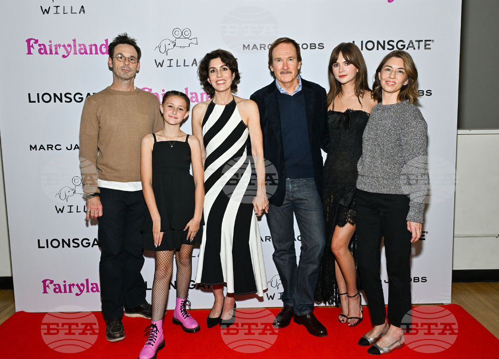 Scoot McNairy, left, Nessa Dougherty, Alysia Abbott, Andrew Durham, Emilia Jones and Sofia Coppola attend the premiere of "Fairyland" at the Angelika Film Center on Thursday, Oct. 2, 2025, in New York. (Photo by Evan Agostini/Invision/AP)