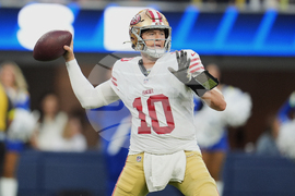 San Francisco 49ers quarterback Mac Jones (10) passes against the Los Angeles Rams during the first half of an NFL football game, Thursday, Oct. 2, 2025, in Inglewood, Calif. (AP Photo/Marcio Jose Sanchez)