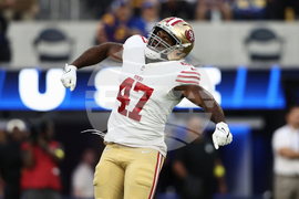 San Francisco 49ers defensive end Bryce Huff (47) celebrates after sacking Los Angeles Rams quarterback Matthew Stafford during the first half of an NFL football game, Thursday, Oct. 2, 2025, in Inglewood, Calif. (AP Photo/Jessie Alcheh)