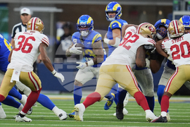 Los Angeles Rams running back Kyren Williams, middle, runs against the San Francisco 49ers during the first half of an NFL football game, Thursday, Oct. 2, 2025, in Inglewood, Calif. (AP Photo/Marcio Jose Sanchez)