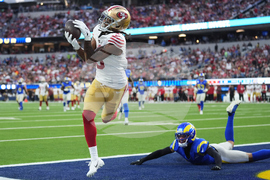 San Francisco 49ers running back Christian McCaffrey (23) catches a pass against Los Angeles Rams safety Jaylen McCollough (2) during the second half of an NFL football game, Thursday, Oct. 2, 2025, in Inglewood, Calif. (AP Photo/Marcio Jose Sanchez)