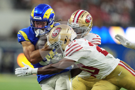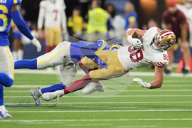 San Francisco 49ers tight end Jake Tonges (88) is tackled by Los Angeles Rams safety Jaylen McCollough during the second half of an NFL football game, Thursday, Oct. 2, 2025, in Inglewood, Calif. (AP Photo/Marcio Jose Sanchez)