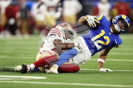 Los Angeles Rams wide receiver Puka Nacua (12) is tackled by San Francisco 49ers cornerback Upton Stout during the first half of an NFL football game, Thursday, Oct. 2, 2025, in Inglewood, Calif. (AP Photo/Jessie Alcheh)