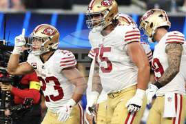 San Francisco 49ers defensive tackle Alfred Collins, bottom, celebrates with teammates after recovering a fumble against the Los Angeles Rams during the second half of an NFL football game, Thursday, Oct. 2, 2025, in Inglewood, Calif. (AP Photo/Marcio Jose Sanchez)