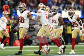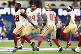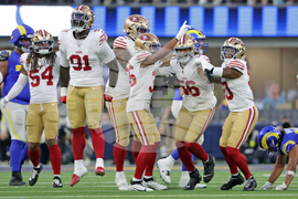 San Francisco 49ers' Fred Warner (54) and teammates celebrate after a defensive stop against the Los Angeles Rams during the second quarter of an NFL football game in Inglewood, Calif., Thursday, Oct. 2, 2025. (Scott Strazzante/San Francisco Chronicle via AP)