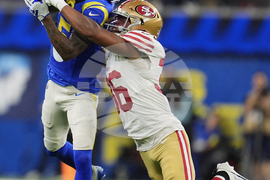 San Francisco 49ers cornerback Deommodore Lenoir (2) breaks up a pass intended for Los Angeles Rams wide receiver Puka Nacua (12) during the second half of an NFL football game, Thursday, Oct. 2, 2025, in Inglewood, Calif. (AP Photo/Marcio Jose Sanchez)