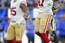 San Francisco 49ers defensive tackle Jordan Elliott, right, celebrates after blocking a point after try against the Los Angeles Rams with defensive tackle Alfred Collins (95) and cornerback Siran Neal (33) during the second half of an NFL football game, Thursday, Oct. 2, 2025, in Inglewood, Calif. (AP Photo/Jessie Alcheh)