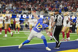 Los Angeles Rams tight end Terrance Ferguson (18) catches a pass over San Francisco 49ers safety Marques Sigle (36) during the first half of an NFL football game, Thursday, Oct. 2, 2025, in Inglewood, Calif. (AP Photo/Marcio Jose Sanchez)