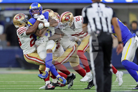 San Francisco 49ers' Upton Stout and teammates gang-tackle Los Angeles Rams' Kyren Williams, second from left, during the second quarter of an NFL football game in Inglewood, Calif., Thursday, Oct. 2, 2025. (Scott Strazzante/San Francisco Chronicle via AP)