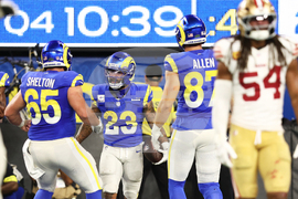 Los Angeles Rams running back Kyren Williams (23) is congratulated by center Coleman Shelton (65) and tight end Davis Allen (87) after scoring against the San Francisco 49ers during the second half of an NFL football game, Thursday, Oct. 2, 2025, in Inglewood, Calif. (AP Photo/Jessie Alcheh)