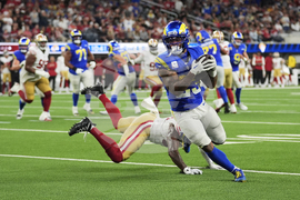 Los Angeles Rams running back Kyren Williams (23) celebrates after scoring against the San Francisco 49ers during the first half of an NFL football game, Thursday, Oct. 2, 2025, in Inglewood, Calif. (AP Photo/Marcio Jose Sanchez)