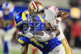 Los Angeles Rams wide receiver Jordan Whittington, left, runs against San Francisco 49ers cornerback Upton Stout, bottom right, during the first half of an NFL football game, Thursday, Oct. 2, 2025, in Inglewood, Calif. (AP Photo/Marcio Jose Sanchez)