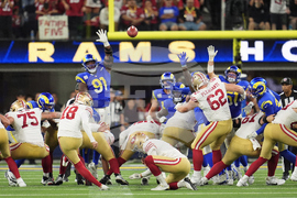 San Francisco 49ers kicker Eddy Piñeiro (18) kicks a field goal during overtime of an NFL football game against the Los Angeles Rams, Thursday, Oct. 2, 2025, in Inglewood, Calif. (AP Photo/Marcio Jose Sanchez)