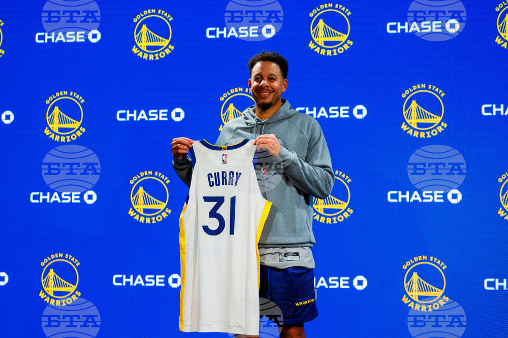 Golden State Warriors guard Seth Curry, the younger brother of Warriors guard Stephen Curry, holds his new jersey during a news conference following an NBA basketball practice in San Francisco, Thursday, Oct. 2, 2025. (Yalonda M. James/San Francisco Chronicle via AP)