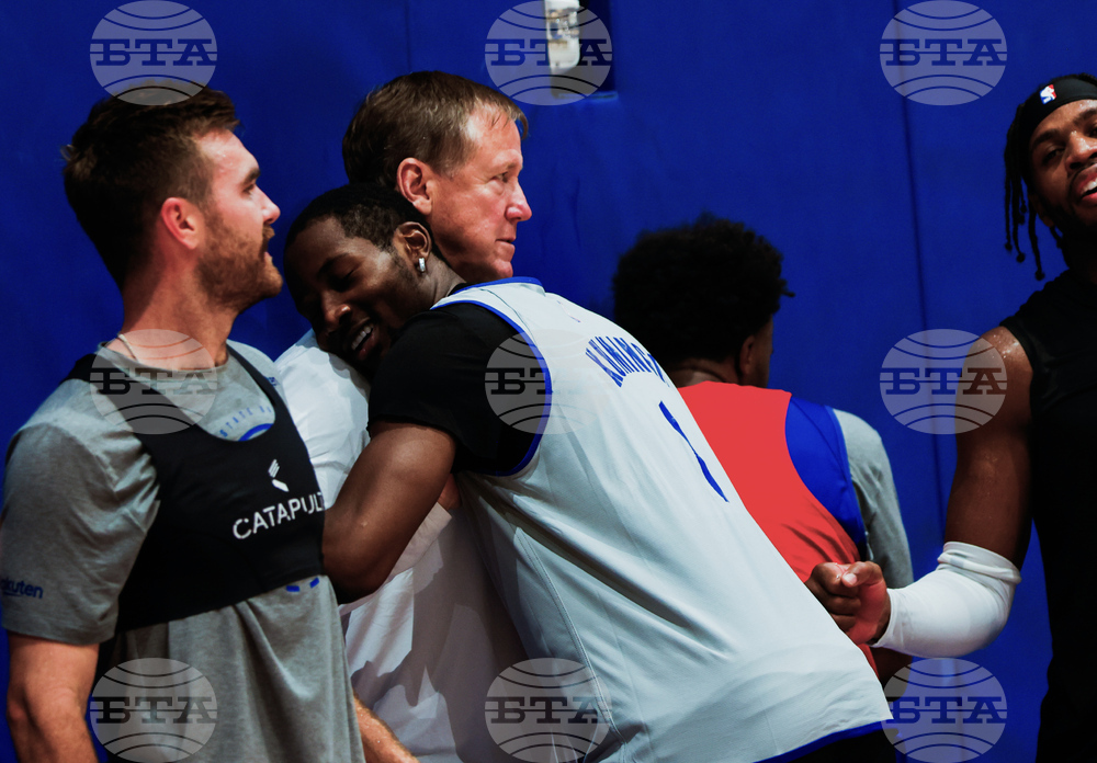 Golden State Warriors forward Jonathan Kuminga (1) hugs assistant coach Terry Stotts while making his first appearance during an NBA basketball practice in San Francisco, Thursday, Oct. 2, 2025, after signing his new contract. (Yalonda M. James/San Francisco Chronicle via AP)