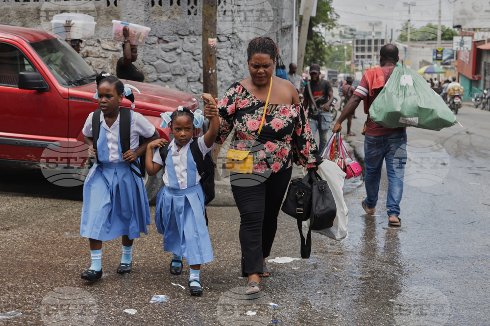 Children cross a street after school in Port-au-Prince, Haiti, Wednesday, Oct. 1, 2025. (AP Photo/Patrice Noel)
