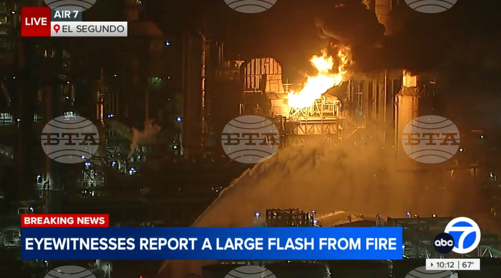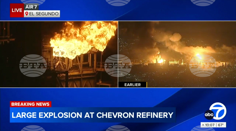 This image taken from video by ABC7 shows flames rising from the Chevron refinery in El Segundo, Calif., Thursday, Oct. 2, 2025. (ABC7 via AP)