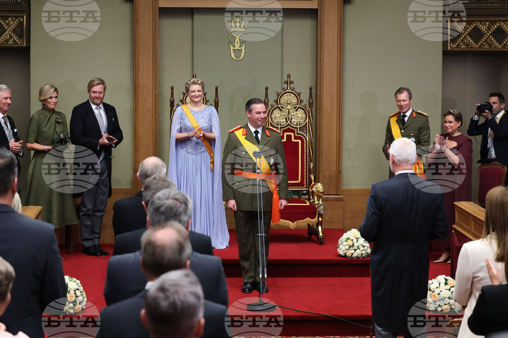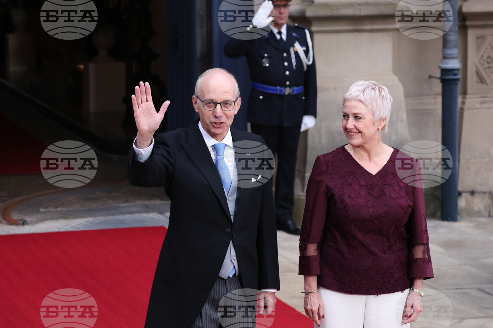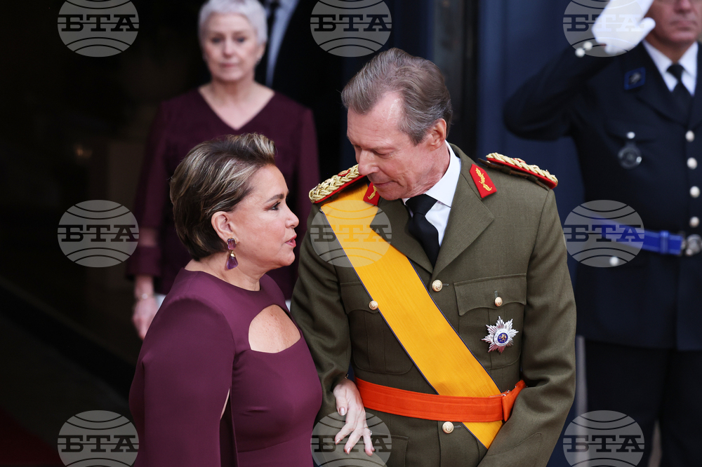 Luxembourg's Grand Duke Guillaume, center left, and Luxembourg's Grand Duchess Stephanie, center right, arrive for a swearing-in ceremony in the session hall of the Chamber of Deputies in Luxembourg, Friday, Oct. 3, 2025. (AP Photo/Omar Havana)