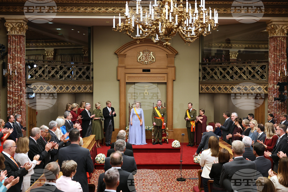 From left, Belgium's Princess Elisabeth, Belgium's Queen Mathilde, Netherland's Princess Amalia, Belgium's King Philippe, Netherland's King Willem Alexander and Netherland's Queen Maxima arrive in the session hall of the Chamber of Deputies prior to the swearing-in ceremony of Luxembourg's Hereditary Grand Duke Guillaume in Luxembourg, Friday, Oct. 3, 2025. (AP Photo/Omar Havana)