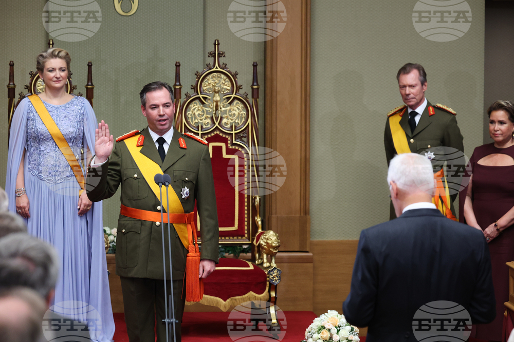 Luxembourg's Grand Duke Guillaume, second left, raises his hand during a swearing-in ceremony in the session hall of the Chamber of Deputies in Luxembourg, Friday, Oct. 3, 2025. (AP Photo/Omar Havana)