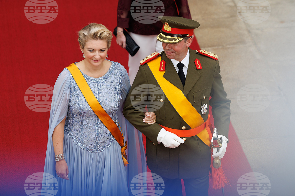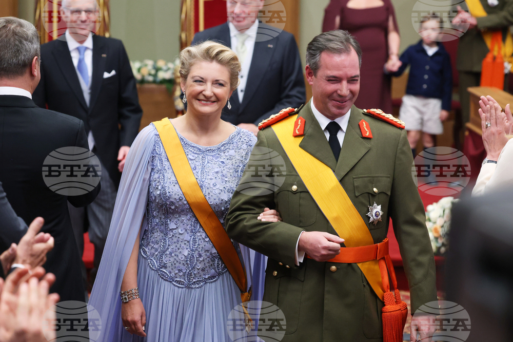 Luxembourg's Grand Duke Guillaume and Luxembourg's Grand Duchess Stephanie, right, during the abdication and enthronement ceremony of Luxembourg's Grand Duke in Luxembourg, Friday, Oct. 3, 2025. (Fred Sierakowski, Pool Photo via AP)