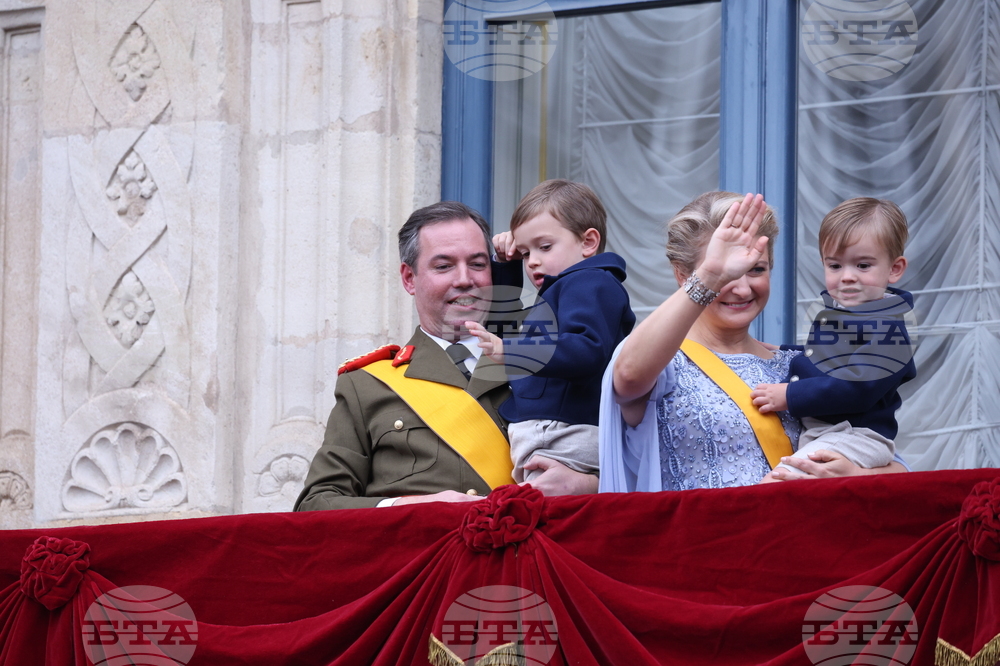 Luxembourg's Grand Duke Guillaume and Luxembourg's Grand Duchess Stephanie wave to the public after attending the abdication and enthronement ceremony of the Grand Duke of Luxembourg at the Grand Ducal Palace in Luxembourg, Friday, Oct. 3, 2025. (AP Photo/Omar Havana)