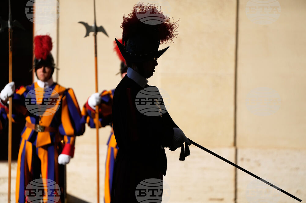 Swiss guards wait for the arrival of Switzerland's President Karin Keller-Sutter on the occasion of a private audience with Pope Leo XIV, at the Vatican, Friday, Oct. 3, 2025. (AP Photo/Gregorio Borgia)