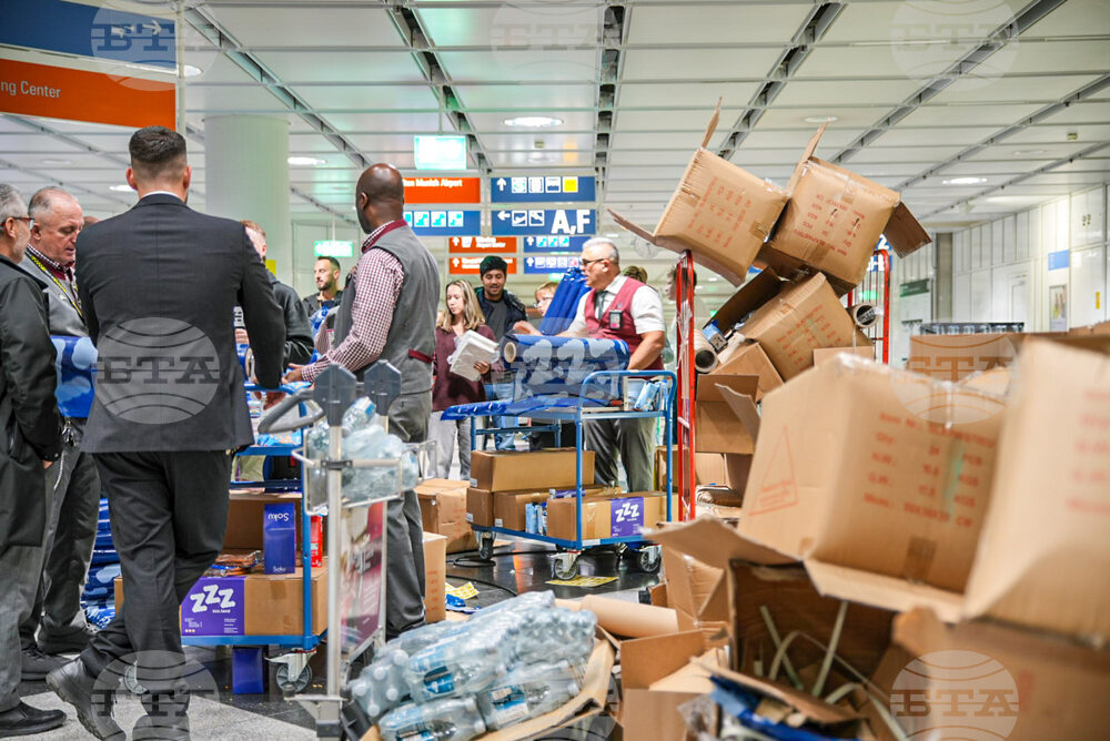 Drinks and snacks are distributed after possible drone sightings closed Munich Airport, Saturday, Oct. 4, 2025, in Munich, Germany. (Enrique Kaczor/onw-images/dpa via AP)