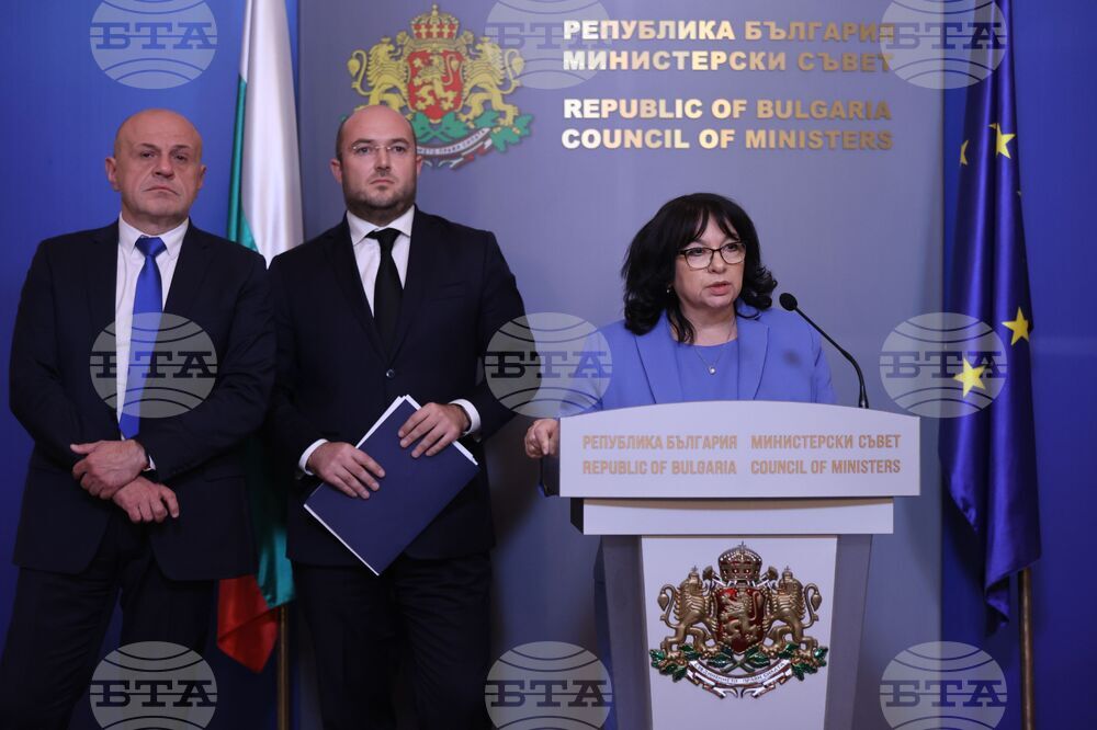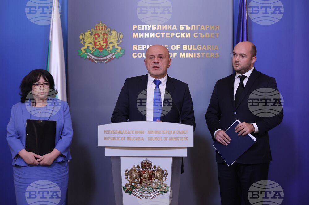 София (3 октомври 2025) Вицепремиерът Томислав Дончев (вляво), министърът на финансите Теменужка Петкова и министърът на правосъдието Георги Георгиев дават пресконференция в Министерски съвет.