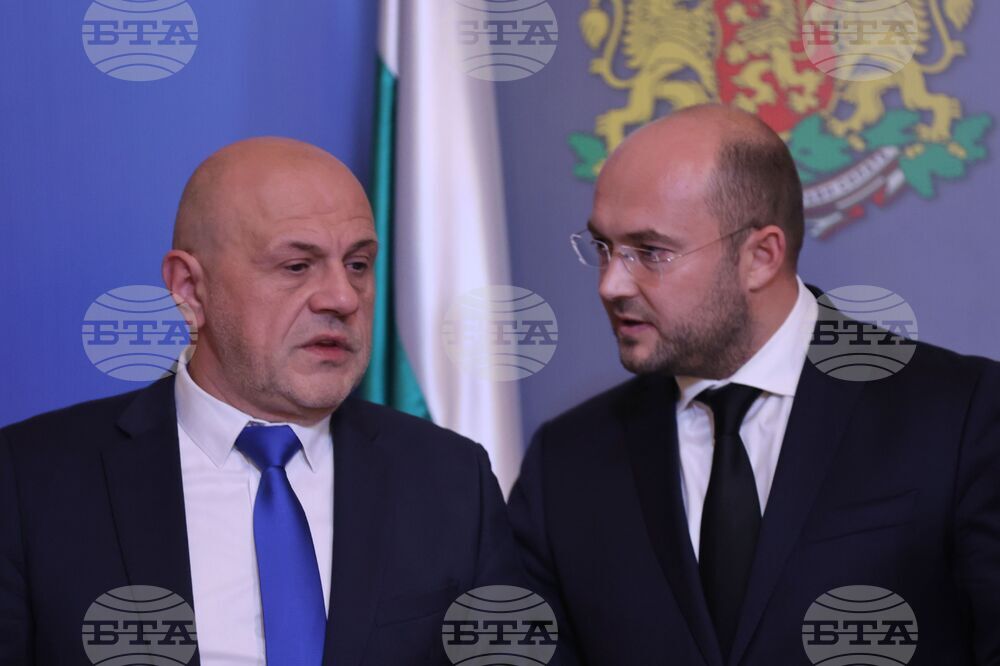 София (3 октомври 2025) Вицепремиерът Томислав Дончев и министърът на правосъдието Георги Георгиев (вдясно) дават пресконференция в Министерски съвет.