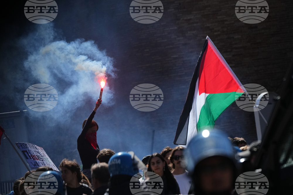 Demonstrators gather for a pro-Palestinians protest in Bologna, Italy, Friday, Oct. 3, 2025. (Guido Calamosca/LaPresse via AP)