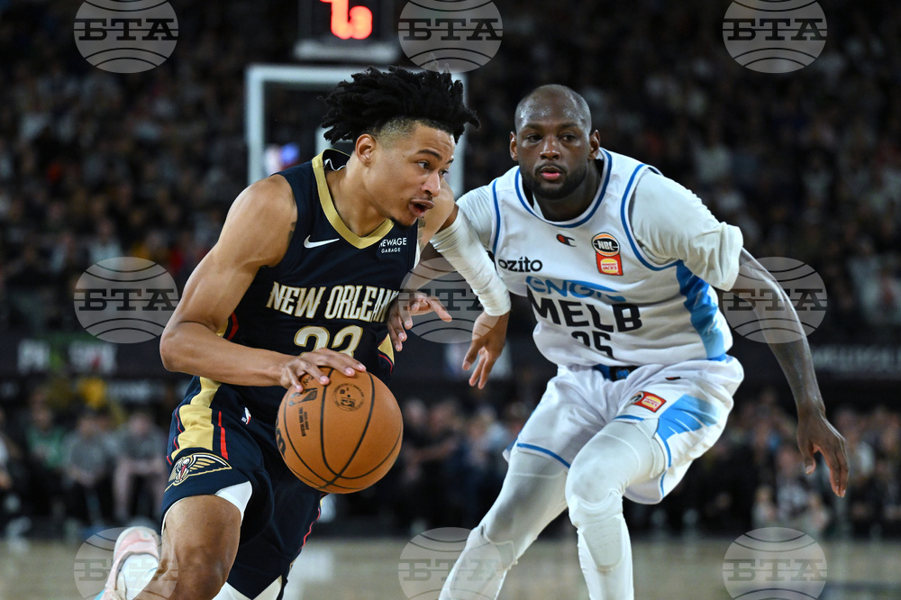 Karlo Matkovic of the New Orleans Pelicans, left, is guarded by a Melbourne United's Jesse Edwards during their NBAxNBL Series exhibition basketball game in Melbourne, Australia, on Friday, Oct. 3, 2025. (James Ross/AAP Image via AP) /AAP Image via AP)