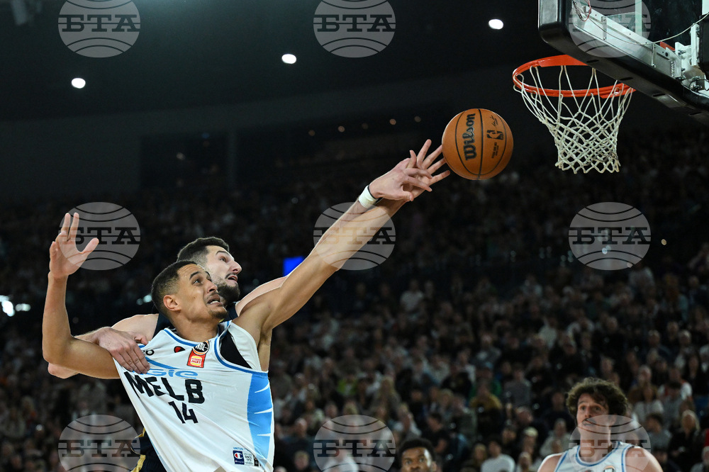 Jesse Edwards of Melbourne United, left, and Karlo Matkovic of the New Orleans Pelicans compete for a rebound during their NBAxNBL Series exhibition basketball game in Melbourne, Australia, on Friday, Oct. 3, 2025. (James Ross/AAP Image via AP) /AAP Image via AP)